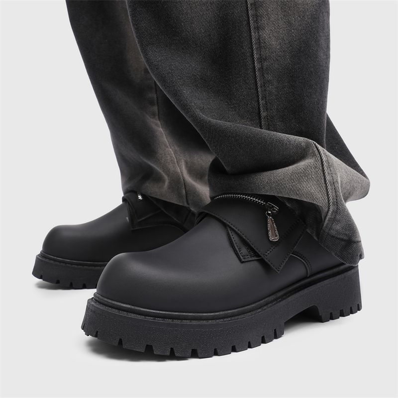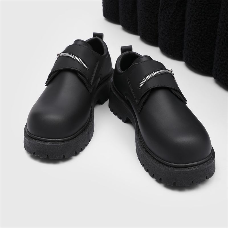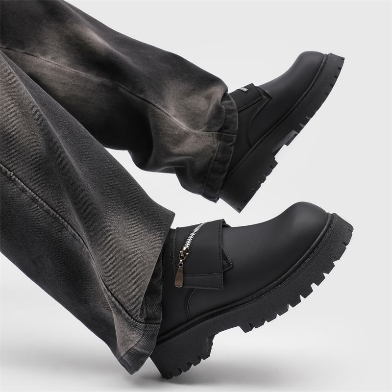 A black slip-on crafted with a bold zipper finish and a heavy chunky sole. Clean, effortless, and built for the ones who move with quiet power. Slip in, lock the look, step different.